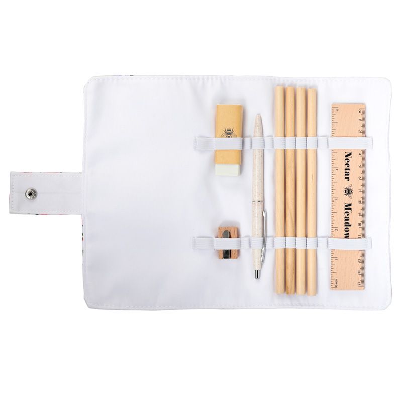- Material: RPET Recycled Bottles Plastic Wrap, Metal Popper, Wooden Ruler and Sharpener, Wheat Straw Pen and Rubber Eraser